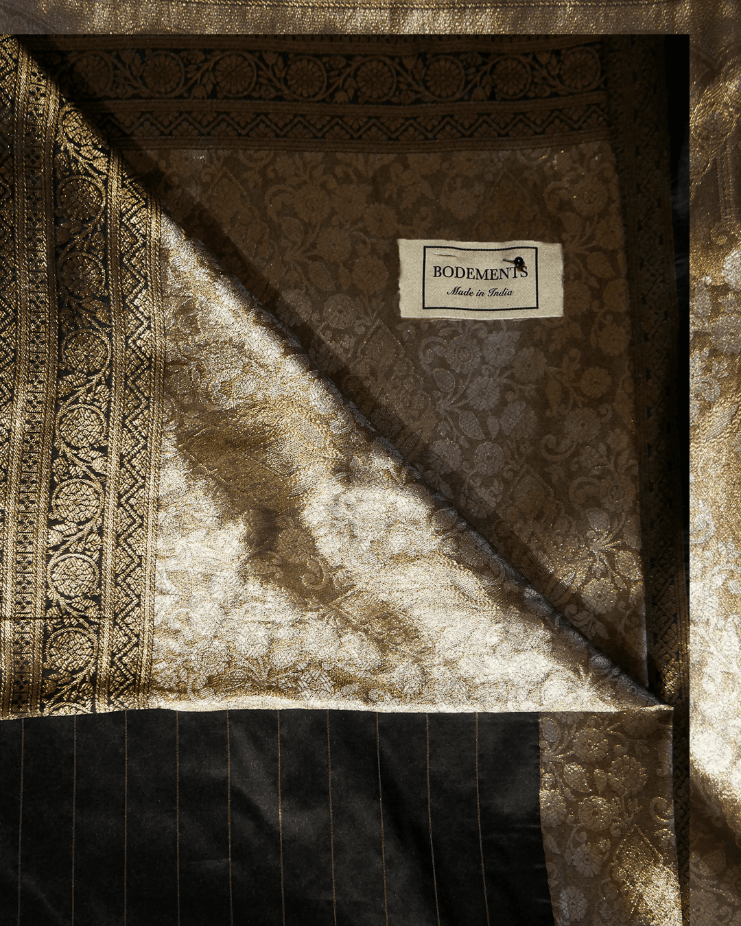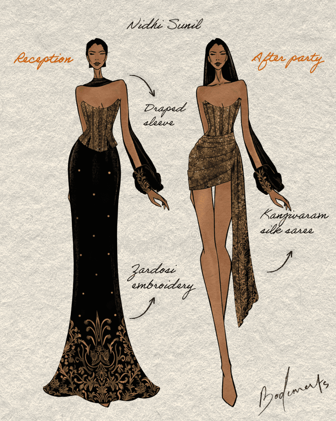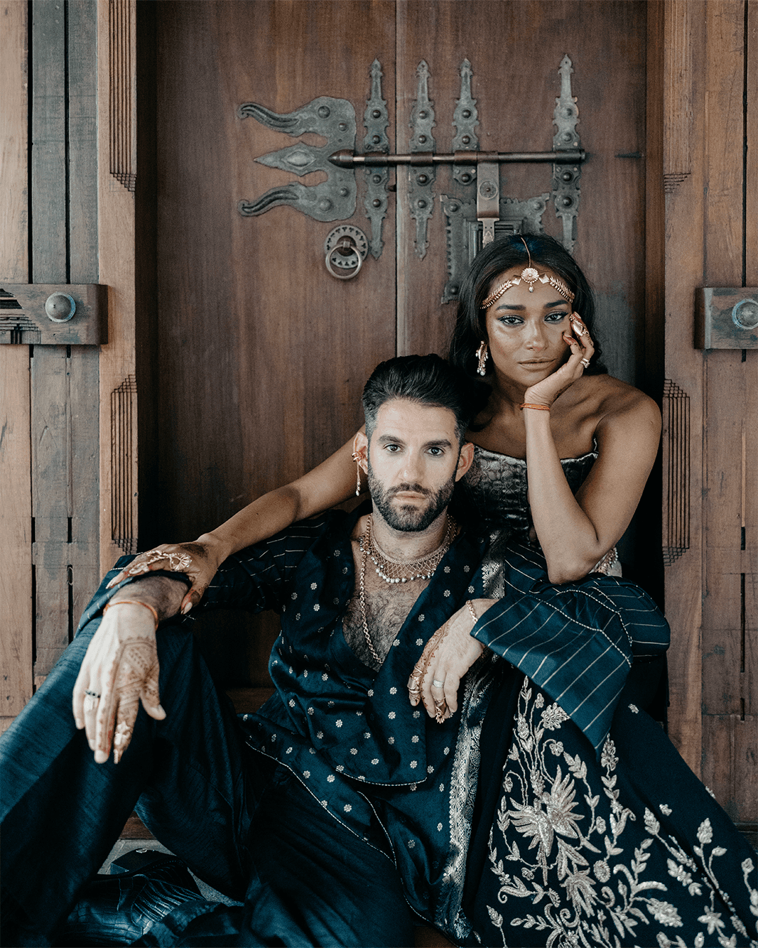 Cut from a Kanjivaram sari, the ensemble carried one story across two looks. Parts of the same textile were reworked into Noah’s outfit, tying them together through shared material.