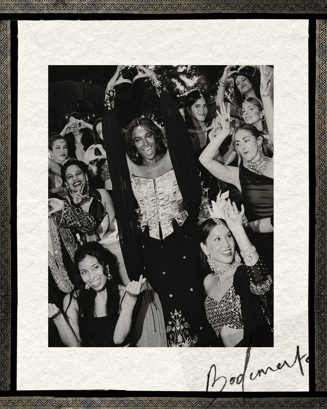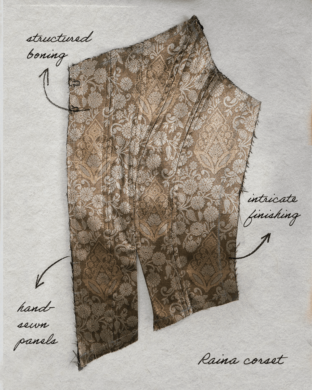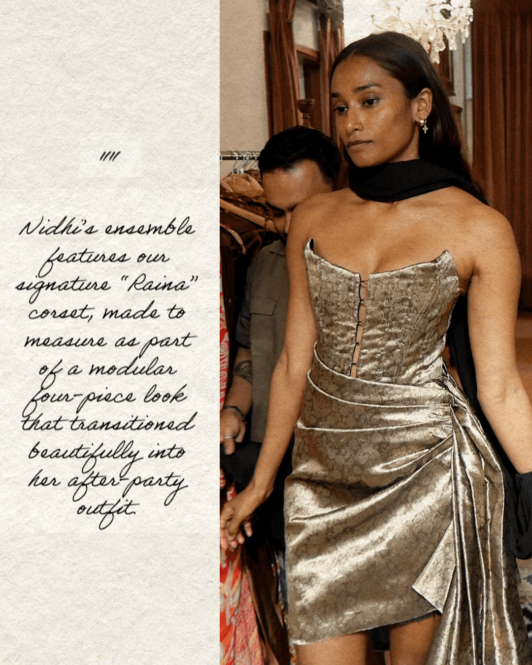 we imagined an ensemble that could stay present through every moment. Anchored by the Raina corset, it unfolded slowly, a silk georgette skirt embroidered in zardosi, a draped sleeve moving with her, structure softened with intention.